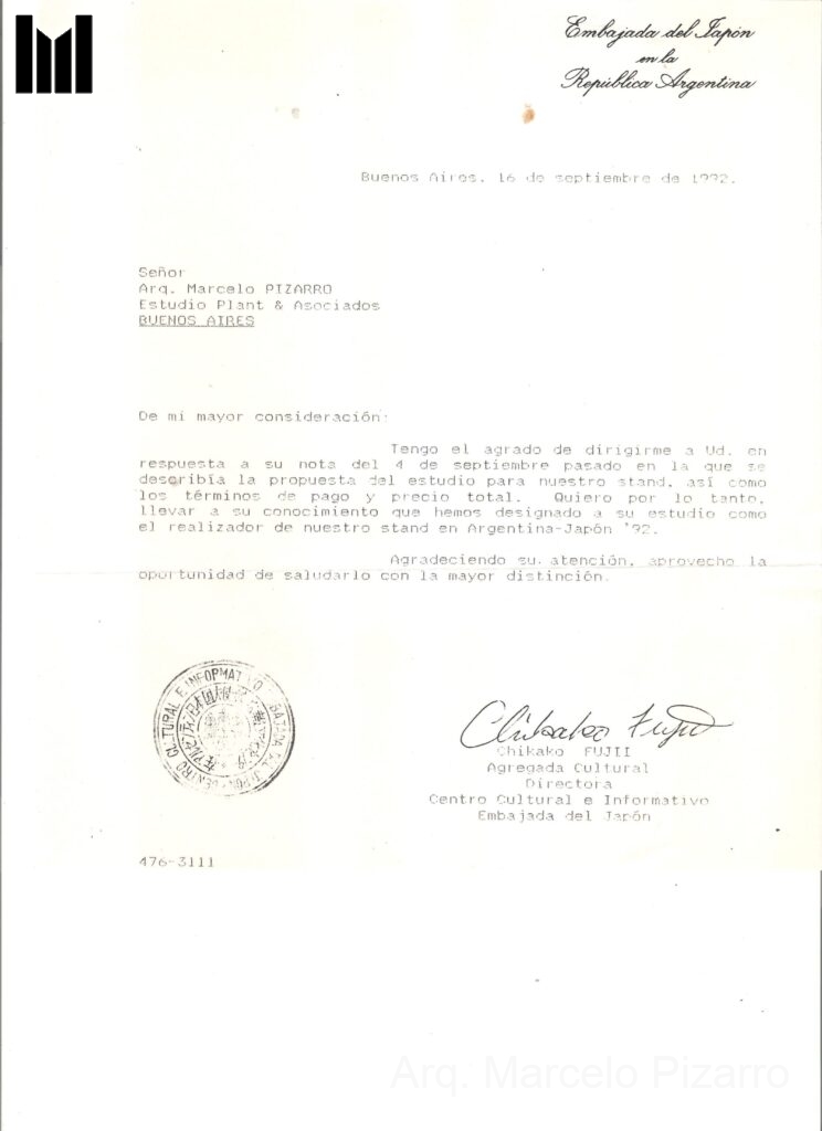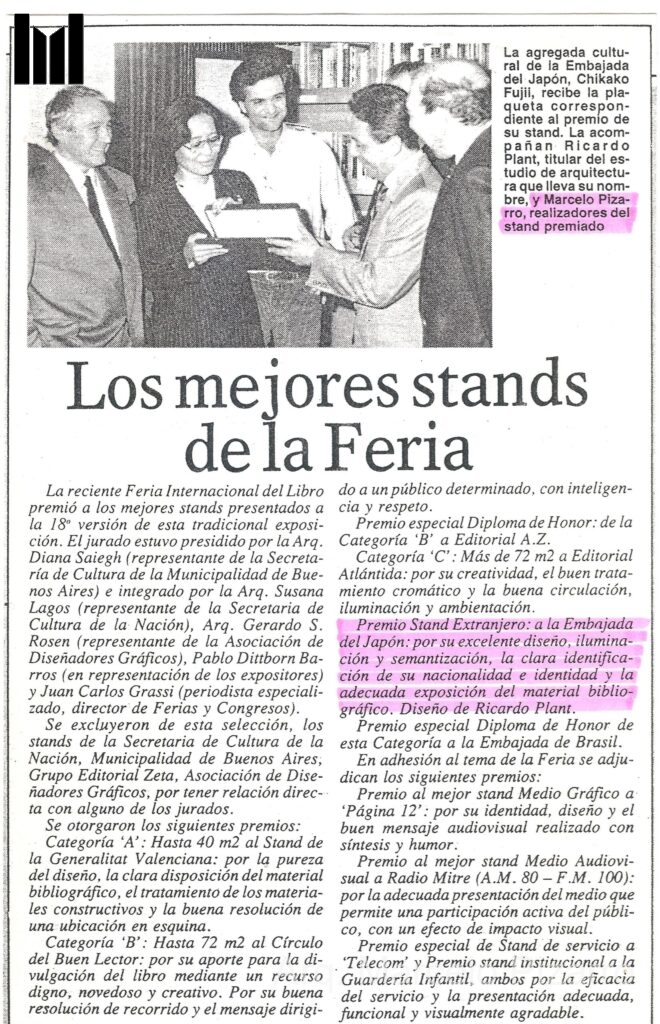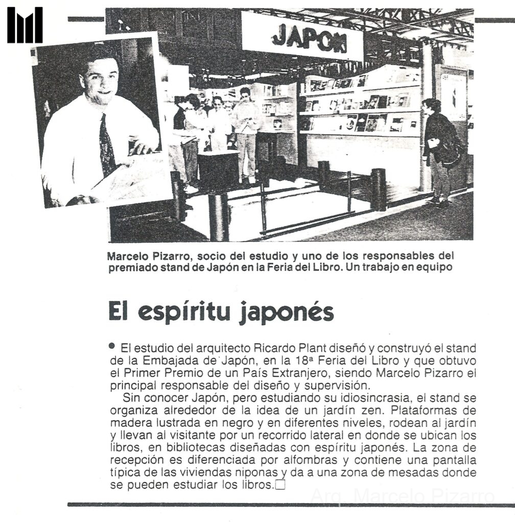 Proyecto y supervisión de obra de la construcción del Stand de la embajada de Japón en la feria del Libro – obteniendo el 1er premio en su categoría. Idea y diseño del Sr. Ricardo Plant